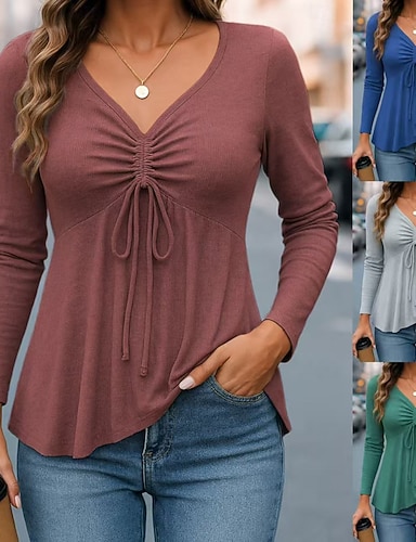 Femmes Chemisier Froncé Cordon de serrage Couleur Unie Élégant Occasionnel manche longue Col en V Hauts Réguliers Quotidien Bleu Rouge Vert Gris Clair Printemps Automne