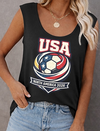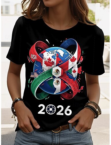 T-shirt femme Coupe du monde de football 2026, imprimé graphique élégant, classique et décontracté, manches courtes, col rond, coupe classique, idéal pour le sport au quotidien, noir, été et printemps