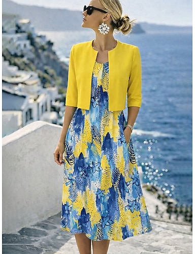 Femmes Robe Ensemble Robe trapèze Élégant Vacances Fleuri Graphique Superposé Imprimé Robe Midi Demi Manches Col ras du cou Quotidien Jaune Rose Claire Gris Été Printemps Coupe régulière