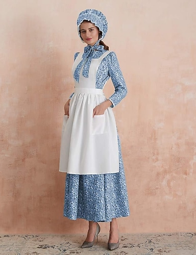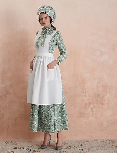 250e anniversaire des États-Unis Période coloniale 19ème siècle Robe Prairie Ensemble bonnet et tablier Manches longues Fille pionnière Epoque Coloniale Guerre d'indépendance américaine Fleuri