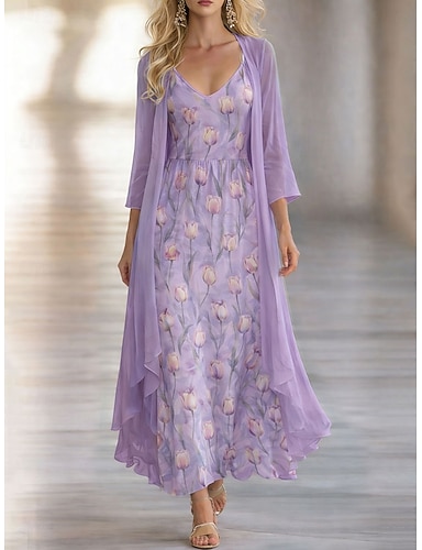 Femmes Robe Ensemble Robe trapèze Élégant Vacances Fleuri Graphique Superposé Imprimé Robe maxi Manche 3/4 Col en V Quotidien Vacances Bleu Jaune Violet Été Printemps Coupe régulière