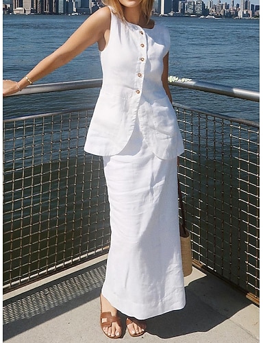 Femmes Ensembles deux pièces Jupe Ensembles Faux coton lin Sans manches Col roulé Col carré Uni Élégant Mode Streetwear Occasionnel Quotidien Extérieur Noir Blanche Beige Été Coupe régulière