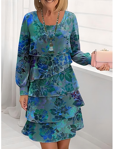 Femmes Robe Longueur Genou Robe trapèze Robe à Plusieurs Couches Occasionnel Coupe régulière Fleuri Graphique manche longue Col ras du cou Bleu Jaune Rouge Violet Printemps Automne Hiver