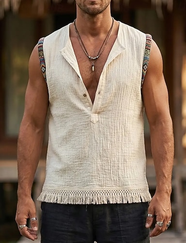 Homme T-shirt Débardeur T-shirt en coton et lin Sans manches Col en V Été Printemps Couleur Unie Streetwear Élégant Ethnique Frange à pompons Patchwork Occasionnel Quotidien Extérieur Blanche T-shirt