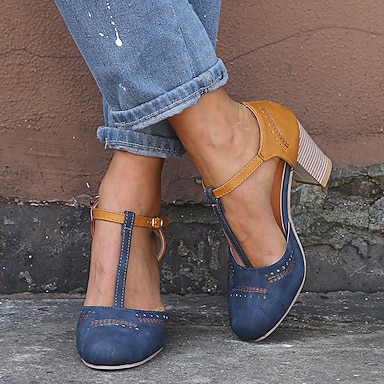 escarpins à talon bloc bleu clair bicolore à bride à la cheville pour femmes – chaussures habillées à bout rond et à bout fermé avec pendentif à breloque pour le bureau et les tenues décontractées