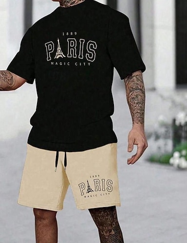 Homme Paris 2 pièces Ensembles de tees Hauts d'été Manche Courte Pantalon court Col ras du cou Sport Occasionnel Extérieur Vacances Sport Impression 3D Été Noir