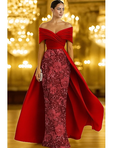 Ligne A Longueur au sol Robe de Soirée Robe de bal avec surjupe Tenue de soirée Élégant Soyeux Manche Courte Épaules Dénudées Formel Mariage Satin Dentelle avec Paillettes