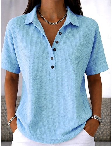 Tunique Femme Waffle Boutons Couleur Unie Simple Vintage Stylé Classique Manches Courtes Col Roulé Tops Quotidien Blanc Rose Bleu Clair Été Printemps