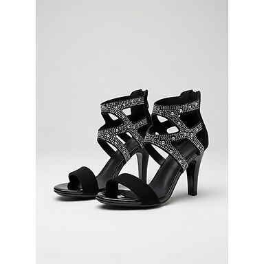 Sandales à talons hauts à lanières noires en strass pour femmes, design à bout ouvert avec détails en zigzag glamour, style de fête élégant pour les rendez-vous quotidiens, les sorties en club, les