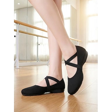 Chaussures de danse stretch noires pour femmes, ballerines à semelle souple et brides croisées, chaussures d'entraînement légères pour danseuses et répétitions en studio