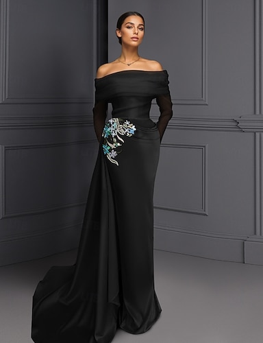 Ίσια Γραμμή Μακρύ Χάντρες Κεντημένο Επίσημο ένδυμα Φόρεμα Μητέρας της Νύφης Βραδινά φορέματα Τουαλέτα Επίσημο ένδυμα Κομψό Μικρό Μαύρο Φόρεμα Μεταξένιο Αμάνικο Ένας Ώμος Γάμου Επίσημο Κάπες