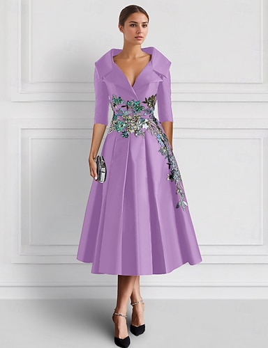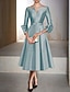 Γραμμή Α Κάτω από το γόνατο Κοκτέιλ Φορέματα Φορέματα για πάρτι Κομψό Μητέρα 3/4 Μήκος Μανικιού Λαιμόκοψη V Επίσημο Επισκέπτης γάμου Σατέν με Πλισέ
