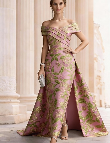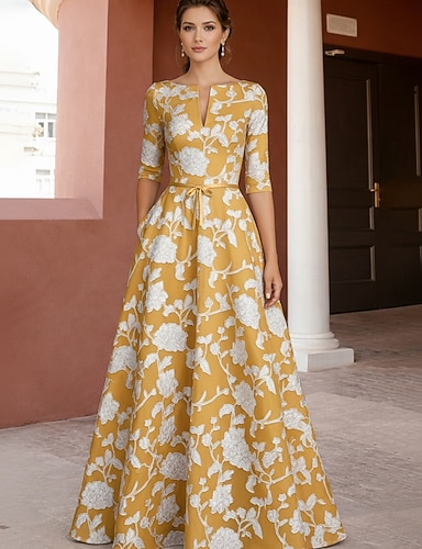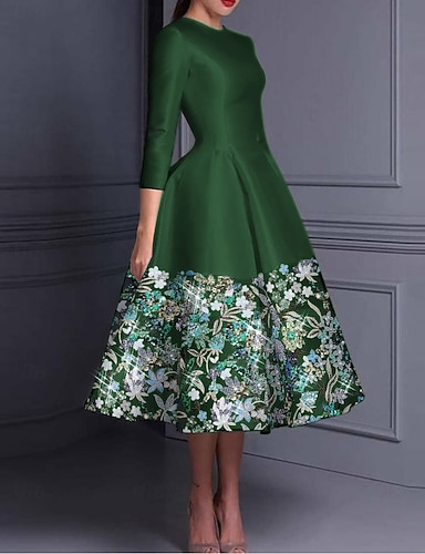 Μπαλαρίνα Φόρεμα Βραδινό Φόρεμα Για τη Μητέρα της Νύφης Επίσημο Φόρεμα Κομψό Γάμου Μάκρος Με Χαμηλό Μανίκι Κολάρο Πουκαμίσα Σατινέ με Σχέδιο