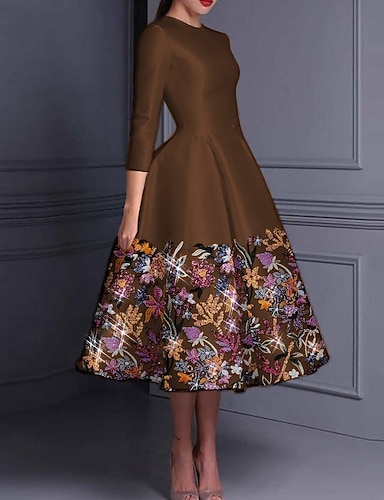 Γραμμή Α Κάτω από το γόνατο Χάντρες Κεντημένο Επίσημο ένδυμα Φόρεμα Μητέρας της Νύφης Κοκτέιλ Φορέματα Φορέματα για πάρτι Κομψό Μπλοκ χρωμάτων 3/4 Μήκος Μανικιού Με Κόσμημα