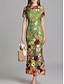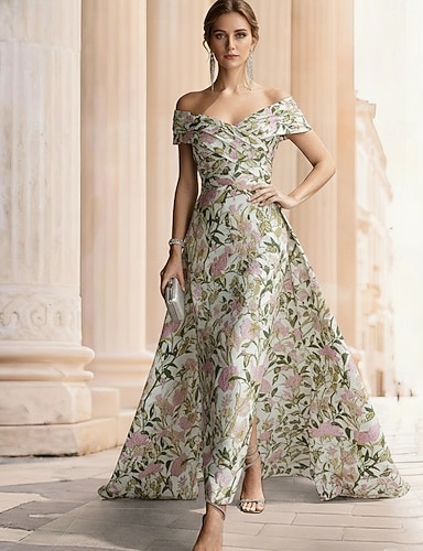 Γραμμή Α Μακρύ Βραδινά φορέματα Τουαλέτα Επίσημο ένδυμα Κομψό Βίντατζ Κοντομάνικο Λαιμόκοψη V Γάμου Επίσημο Τσέπη Σατέν με Άνθινο Εμπριμέ