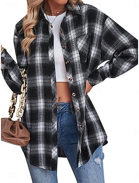 Γυναικεία Μπουφάν πουκάμισο Σακί Διατηρείτε Ζεστό Αναπνέει Κουμπιά Τσέπη Στάμπα Καθημερινό Καρό Διακοπές Δρόμος Καθημερινά Ρούχα Εξόδου Μονόπετο Κανονικό Απορρίπτω Κανονικό Μακρυμάνικο