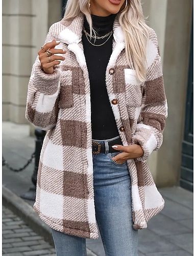 Γυναικεία Μπουφάν Sherpa Άνετο Αναπνέει Τσέπη Κουμπιά Στάμπα Καθημερινό Καρό Διακοπές Δρόμος Causal Καθημερινά Ρούχα Μονόπετο Μακρύ Απορρίπτω Χαλαρή Εφαρμογή Μακρυμάνικο Εξωτερικά ενδύματα