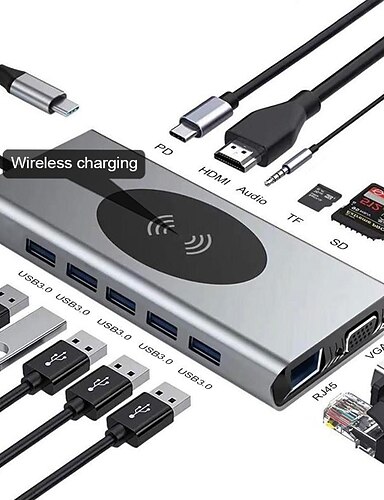 Προσαρμογέας διανομέα usb c 13 σε 1 με ασύρματη φόρτιση USB c σε hdmi 3,5 mm υποδοχή ήχου sd tf hdmi vga rj45 usb3.0 σταθμός σύνδεσης για macbookpro