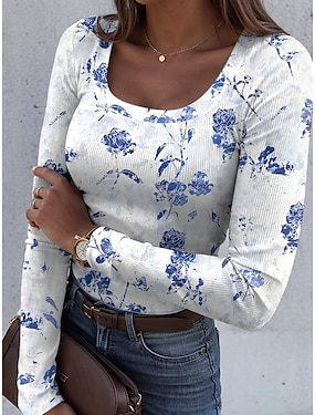 Γυναικείο T-Shirt Ριμπ γραφικό τετράγωνο λαιμόκοψη μακρυμάνικο casual λουλουδάτα κανονικά μπλουζάκια καθημερινή εκτύπωση κόκκινο μπλε μωβ πράσινο άνοιξη φθινόπωρο