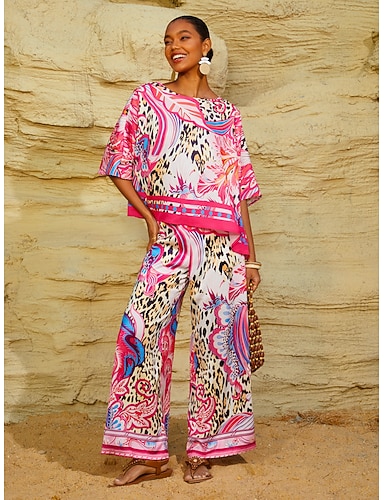 Γυναικεία Σετ Δύο Τμημάτων Λινά Σακάκια Παντελόνια Μπόρο Μπλουζάκι 3/4 Μήκος Μανίκι V Λαιμόκοψη Γραφικό Γεωμετρικό Εκτύπωση Καθημερινό Στυλάτο Καστόν Διακοπές Μπλε Ροζ Πράσινο Καλοκαίρι Χαλαρή Φόρμα