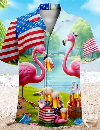 Ανδρικά Φοινικόπτερος Αμερικάνικη σημαία Χαβανέζικο πουκάμισο Πουκάμισο Aloha Κοντομάνικο Χαβανέζα Διακοπές Καλοκαίρι Κουβανέζικο γιακά Κουμπί επάνω Πράσινο του τριφυλλιού