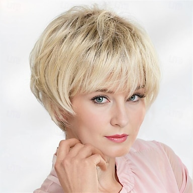 κοντές ξανθές περούκες pixie κομμένες για λευκές γυναίκες με στρώσεις κοντές κυματιστές ξανθές περούκες με σκούρες ρίζες γυναικείες περούκες από συνθετικά μαλλιά με φυσική εμφάνιση