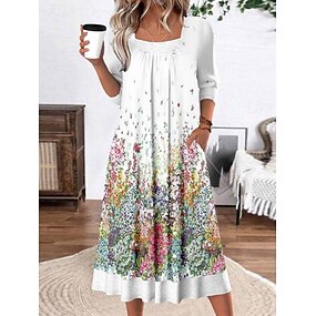 Γυναικεία Μίντι φόρεμα Φόρεμα ριχτό Καθημερινό Καθημερινά Κανονικό Φλοράλ Γραφική Αφηρημένο Μακρυμάνικο Τετράγωνη Λαιμόκοψη Λευκό Καλοκαίρι Άνοιξη Φθινόπωρο Χειμώνας
