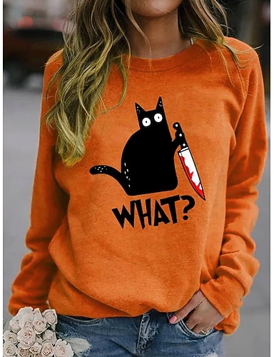 Γυναικεία Φούτερ Μαύρη Γάτα Γραφικό Γάτα Casual Μακρυμάνικο Crew Neck Κανονικά Τοπ Δρόμος Καθημερινά Casual Εκτύπωση Πορτοκαλί Πράσινο Γκρι Φθινόπωρο Χειμώνας