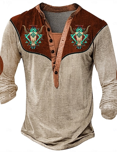 Ανδρικά Φυλής Cowboy Μπλουζάκι Πουκάμισο Henley Μακρυμάνικο 3D εκτύπωση Υψηλής Ποιότητας Ρετρό / Βίντατζ δυτικό στυλ Δρόμος Causal Καθημερινά Καλοκαίρι Άνοιξη Φθινόπωρο Ανοικτό Καφέ Θαλασσί Καφέ Χένλι
