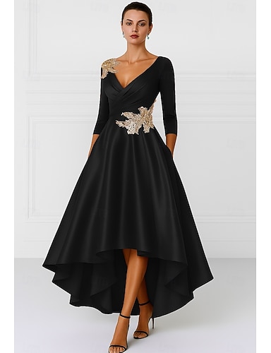 Μαύρο Κόκκινο Φόρεμα A-Line Μητέρας της Νύφης Elegant V Λαιμόκοψη Ασύμμετρο Σατέν Μακρύ Μανίκι με Απλικέ