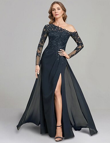 Φόρεμα Σακάκι Μαμά της Νύφης Επίσημο Elegant Ένα Ικανό Λαιμό Δαπέδου Μήκους Σατέν Μακρύ Μανίκι με Δαντέλα Μονοχρωμία