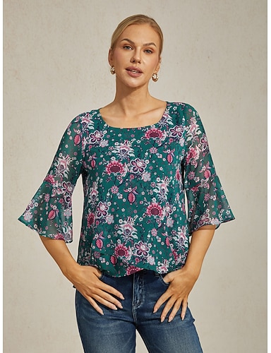 γυναικεία μπλούζα με διαφανές σιφόν πράσινο φλοράλ σχέδιο, μισό μανίκι με στρώσεις και στρογγυλή λαιμόκοψη