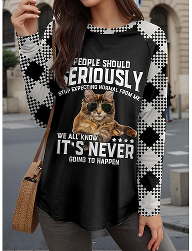Γυναικείο Τ-shirt Μακρύ Μανίκι Γάτα Γράμμα Καθημερινό Μακρύ Μανίκι Crew Neck Μακριά Ρούχα Καθημερινά Εκτύπωση Μαύρο Άνοιξη Φθινόπωρο Προ-φθινόπωρο