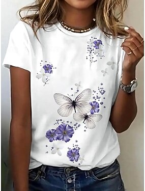 Γυναικεία Μπλουζάκι Φλοράλ Πεταλούδα Στυλάτο Καθημερινό Κοντομάνικο Στρογγυλή Ψηλή Λαιμόκοψη Κανονικά μπλουζάκια Καθημερινά Στάμπα Λευκό Καλοκαίρι