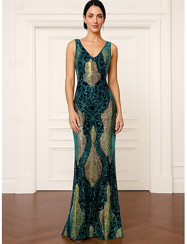 Ίσια Γραμμή Φόρεμα Μητέρας της Νύφης Κομψό Βίντατζ Φανταχτερό Λαιμόκοψη V Μακρύ Με πούλιες Πολυεστέρας Αμάνικο με Χάντρες