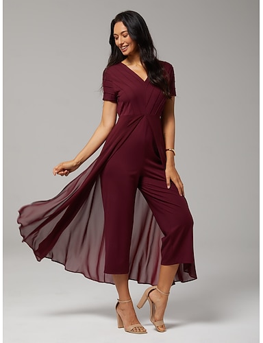 γυναικεία ολόσωμη φόρμα κόκκινο κρασί με V λαιμόκοψη, σχέδιο με επένδυση από ύφασμα, δύο τεμαχίων, αέρινη, διαφανής εμφάνιση, ελαστικό ύφασμα, casual, άνοιξη καλοκαίρι, φθινόπωρο