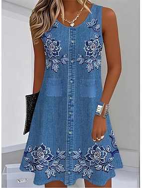 Γυναικεία Μίνι φόρεμα Φόρεμα για τον ήλιο Φόρεμα σε γραμμή Α Καλοκαιρινό φόρεμα Διακοπές Καθημερινό Καθημερινά Κανονικό Γραφική Σκέτο Αμάνικο Λαιμόκοψη U Θαλασσί Σκούρο μπλε Καλοκαίρι
