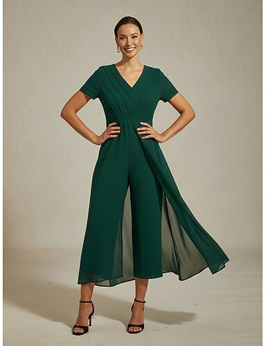 γυναικεία ολόσωμη φόρμα σκούρο πράσινο με V λαιμόκοψη, σχέδιο με επένδυση από ύφασμα, δύο τεμαχίων, αέρινη, διαφανής εμφάνιση, ελαστικό ύφασμα, προορισμός για καλεσμένους γάμου, άνοιξη καλοκαίρι, φθινόπωρο