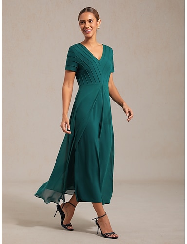 Φόρεμα Τσαγιού Μήκους Επίσημο από Στρας Φόρεμα Σχήμα Α Φόρεμα Κάπα Κομψό Γάμος Καλεσμένη Πάρτι Κοκτέιλ Κανονική Εφαρμογή Απλό Μισό Μανίκι Λαιμόκοψη V Σκούρο Πράσινο Καλοκαίρι Άνοιξη Φθινόπωρο