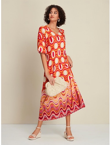 Γυναικεία Φαρδύ φόρεμα Ρούχα θερέτρου Μακρύ φόρεμα Βαθυγάλαζο 3/4 Μήκος Μανικιού Folk Εκτύπωση Ανοιξη καλοκαίρι Λαιμόκοψη V Διακοπές Καθημερινό Τ M L