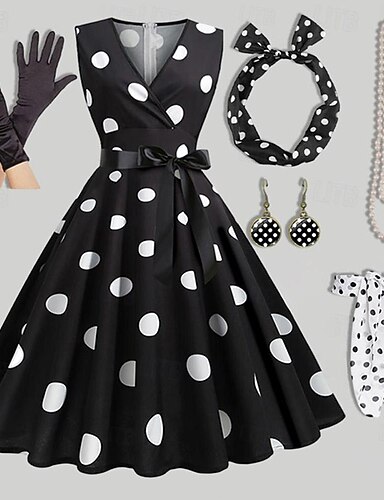 Γυναικείο Φόρεμα A-Line Rockabilly Φόρεμα με Πουά Φόρεμα Swing Φόρεμα Flare με Σετ Αξεσουάρ 1950s Grease Outfits 60s Retro Vintage με Κεφαλόδεσμο Σαπούνι Σκούφιο Σκουλαρίκια Χάντρα Λαιμού Γάντια