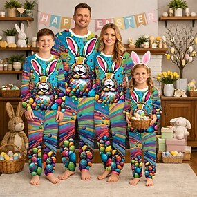 Οικογένεια Κοίτα Πάσχα Πυτζάμες Γραφική Λαγουδάκι Causal Στάμπα Ανθισμένο Ροζ Μακρυμάνικο Διακοπές Αντιστοίχιση ρούχων