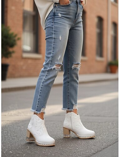 γυναικεία λευκά δερμάτινα δυτικά μποτάκια - διακοσμητικά με καρφιά, κεντημένο σχέδιο και χοντρό ξύλινο τακούνι για μοντέρνα casual σύνολα