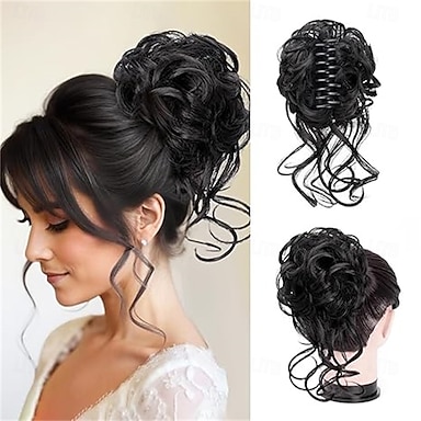 2 τεμάχια γυναικεία ακατάστατα μαλλιά σε κότσο, αποσπώμενα κλιπ με νύχια, κυματιστά σγουρά συνθετικά, σετ μαλλιών για ανέμελες μπούκλες με έλικες, ψεύτικα λαστιχάκια μαλλιών, επέκταση αλογοουράς,