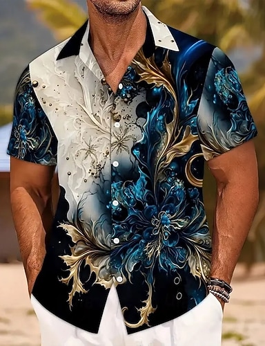Ανδρικά Φλοράλ Λουλούδι Πουκάμισο Πουκάμισο με κουμπιά Κοντομάνικο Μόδα Casual Διακοπές Αργίες Ρούχα παραλίας Καλοκαίρι Άνοιξη Απορρίπτω γιακά πουκάμισα Θαλασσί