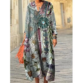 Γυναικεία Μίντι φόρεμα Φόρεμα ριχτό Διακοπές Καθημερινό Μπόχο Εξόδου Παραλία Χαλαρή Εφαρμογή Φλοράλ Γραφική Μακρυμάνικο Λαιμόκοψη V Κίτρινο Ανθισμένο Ροζ Βυσσινί Άνοιξη Φθινόπωρο Χειμώνας