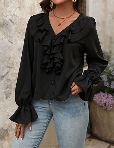 Γυναικεία Πουκάμισο Ντυτές μπλούζες Συμπαγές Χρώμα Σκέτο Κομψό Στυλάτο Βασικό Μακρυμάνικο Λαιμόκοψη V Κανονικά μπλουζάκια Δουλειά Καθημερινά Αργίες Σουρωτά Με Βολάν Κουμπιά Μαύρο Φθινόπωρο Χειμώνας