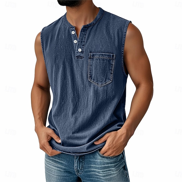 Ανδρικό vintage γιλέκο 100% βαμβάκι, αμάνικο πουκάμισο Henley, καλοκαιρινό, φθινόπωρο, απλό, σχεδιαστής μόδας, κλασικό, διακοπές, δρόμος, μαύρο, ροζ, μπλε, μπλουζάκι για άνδρες #10358235