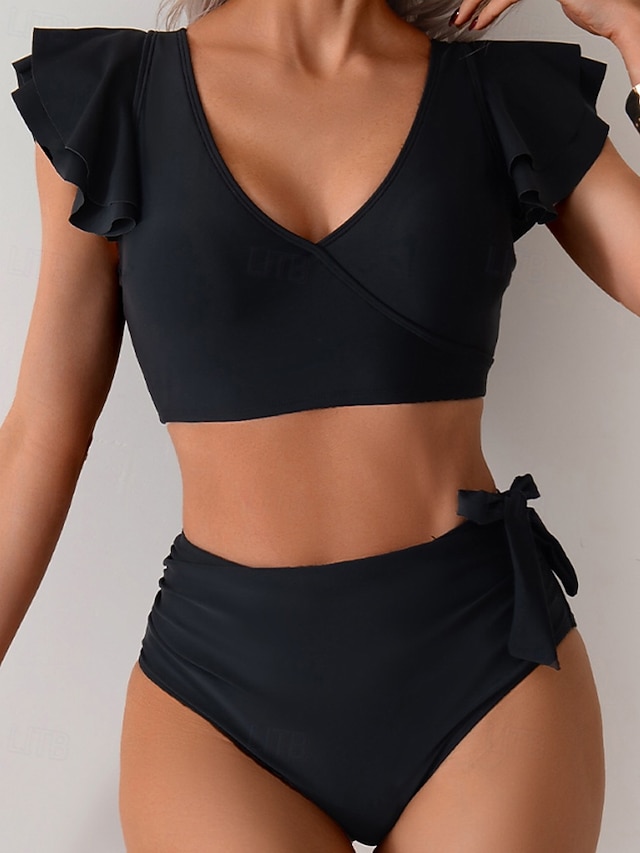 Γυναικεία Μαγιό 2 κομμάτι Προκλητικό Μαγιό Σουρωτά Κουρελού Εξώπλατο Διακοπές Ρούχα παραλίας Συνδυασμός Χρωμάτων Λαιμόκοψη V Αμάνικο Μαγιό #10616708