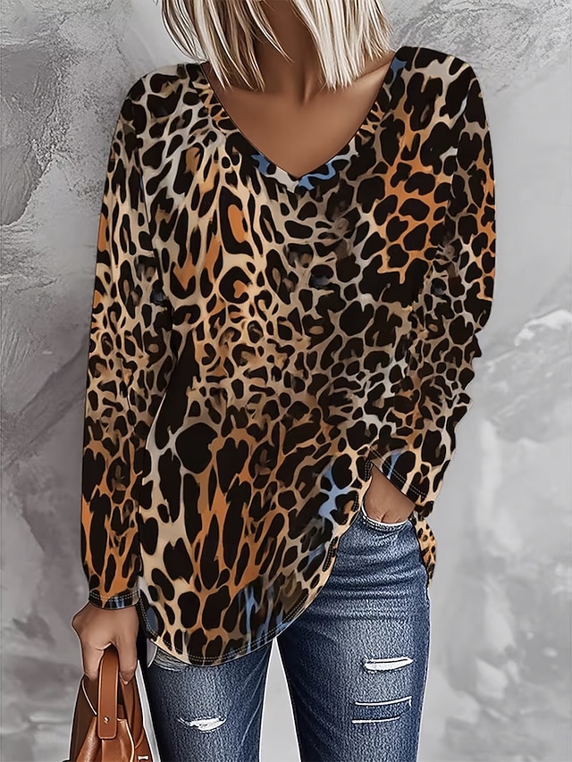 Γυναικεία Μπλουζάκι Στάμπα Γραφική Λεοπάρ Βίντατζ Μοντέρνα Στυλάτο Μακρυμάνικο Λαιμόκοψη V Κανονικά μπλουζάκια Καθημερινά Θαλασσί Άνοιξη Φθινόπωρο #10740579